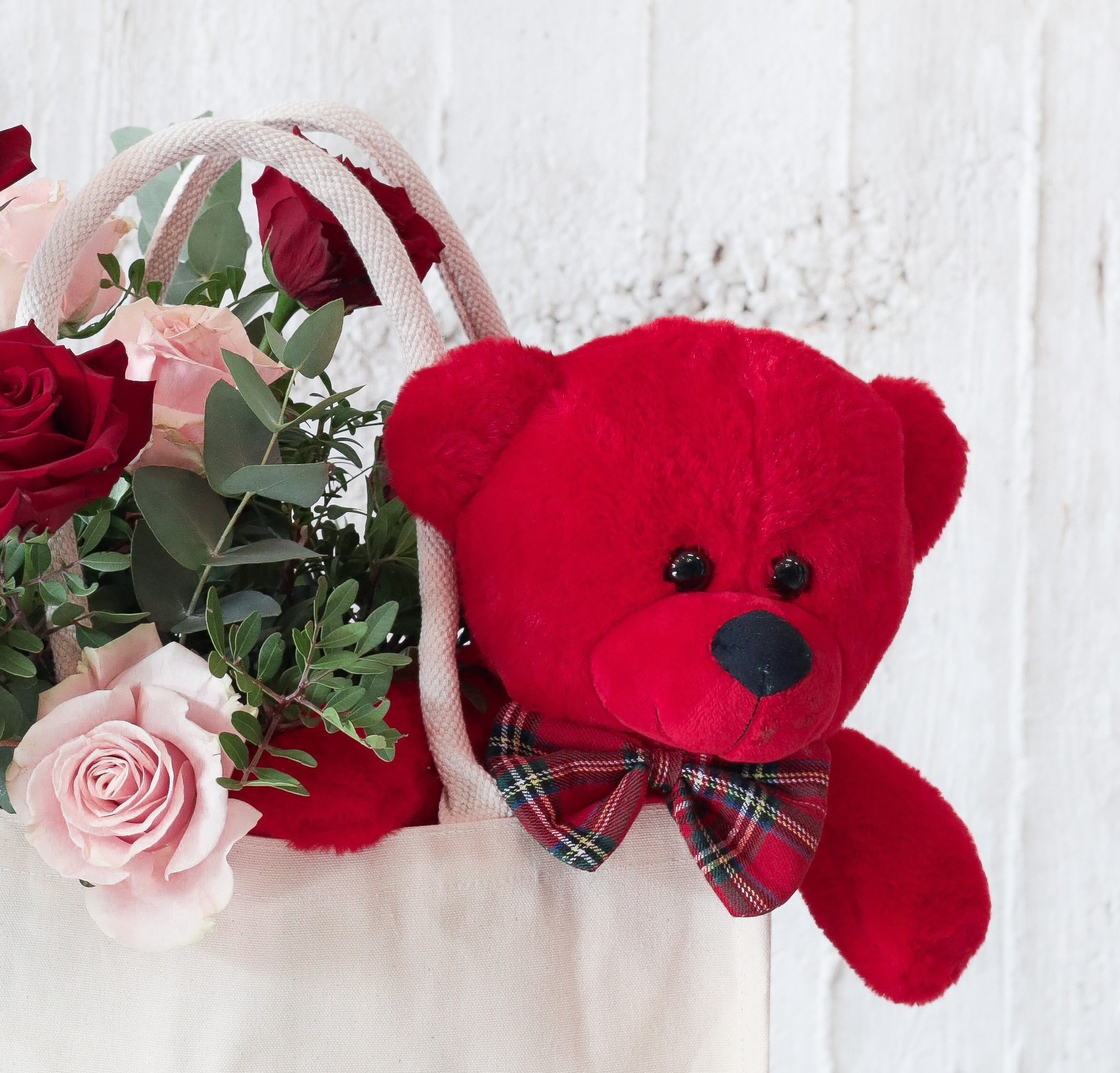 The Duo: A lush arrangement of deep red and soft pink roses paired with a charming red plush teddy bear peek-a-boo style.