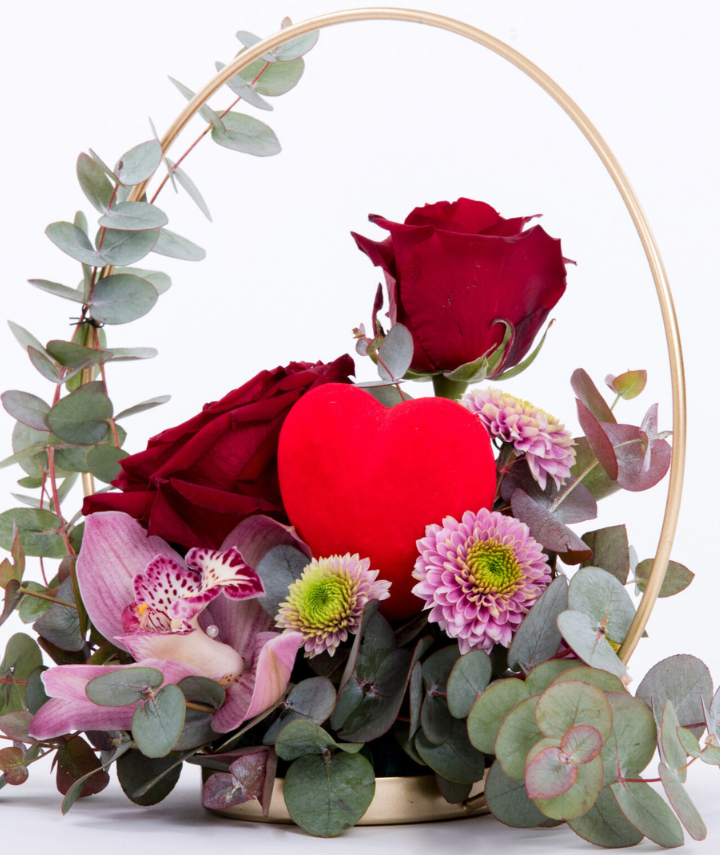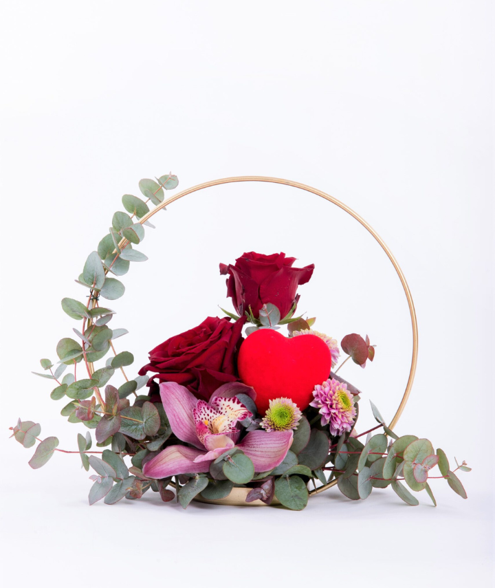 Love Circle – A stunning 27 cm metallic gold circle, elegantly adorned with fresh blooms. Featuring velvety red roses, delicate orchids, and lush greenery, this artistic arrangement symbolizes endless love and beauty. A timeless decorative piece, perfect for making any space feel truly special.