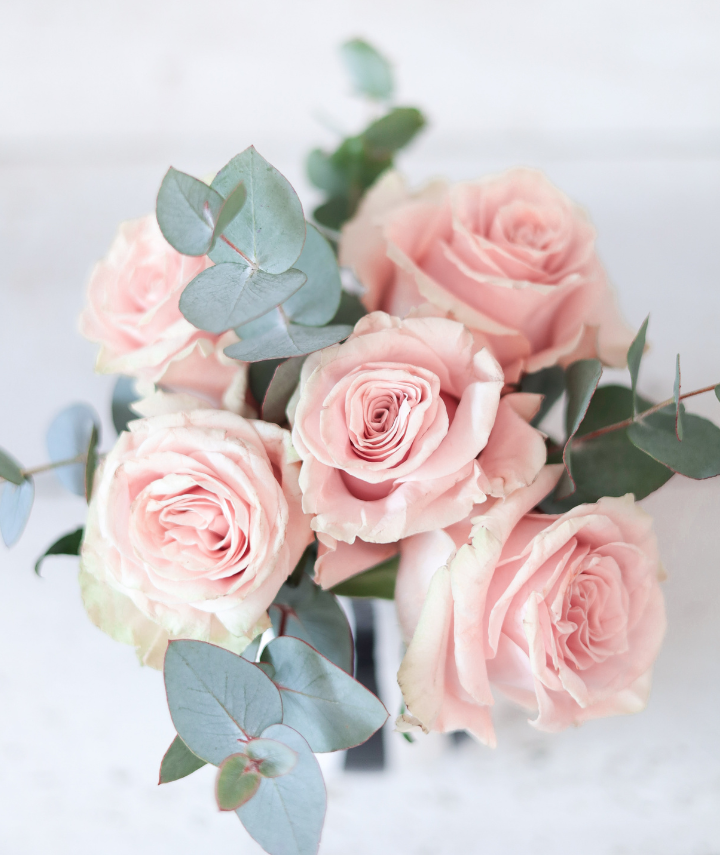The Flowers: Five (5) premium roses in soft pink, or the color of your choice, accented with fresh eucalyptus sprigs for a natural touch.