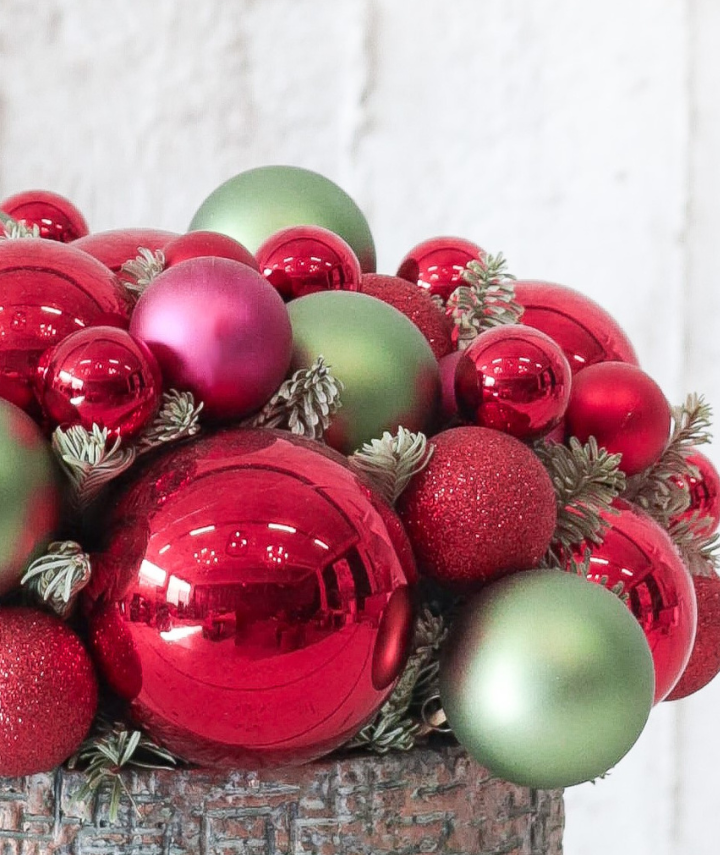 The Design: A dense, rounded arrangement of lustrous holiday ornaments, meticulously curated to look like a gourmet festive treat.