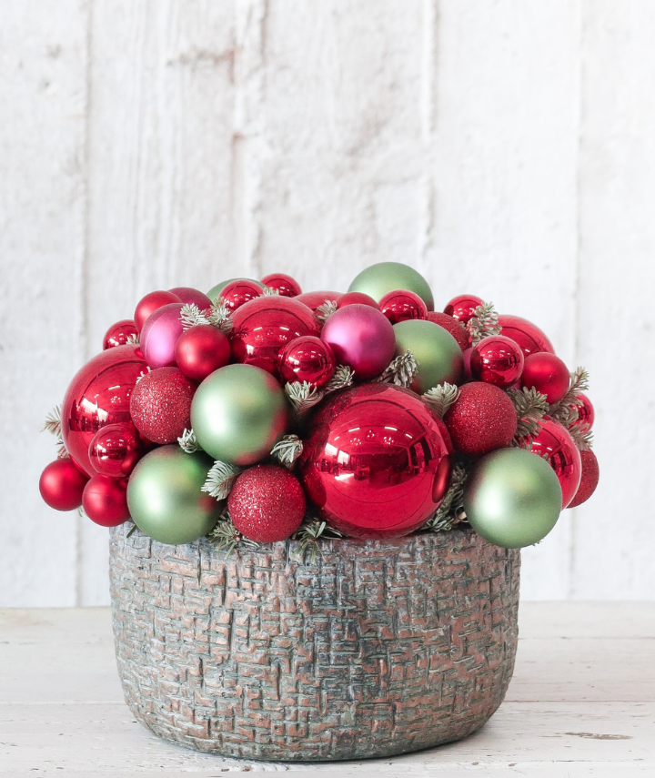 The Base: Set in a heavy, rustic stone-finish bowl that adds a sophisticated, grounded touch to the bright ornaments.