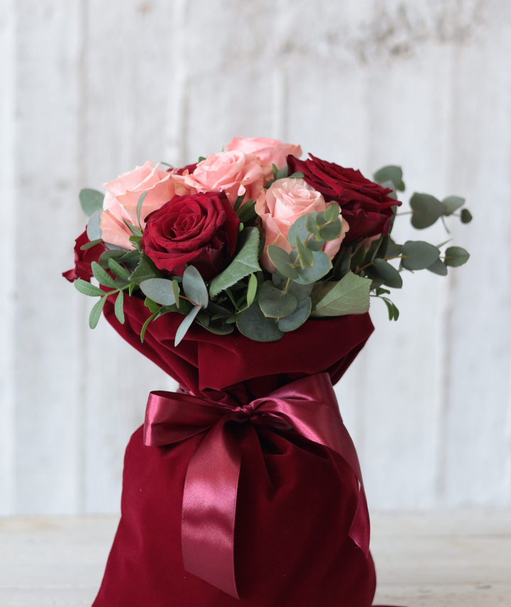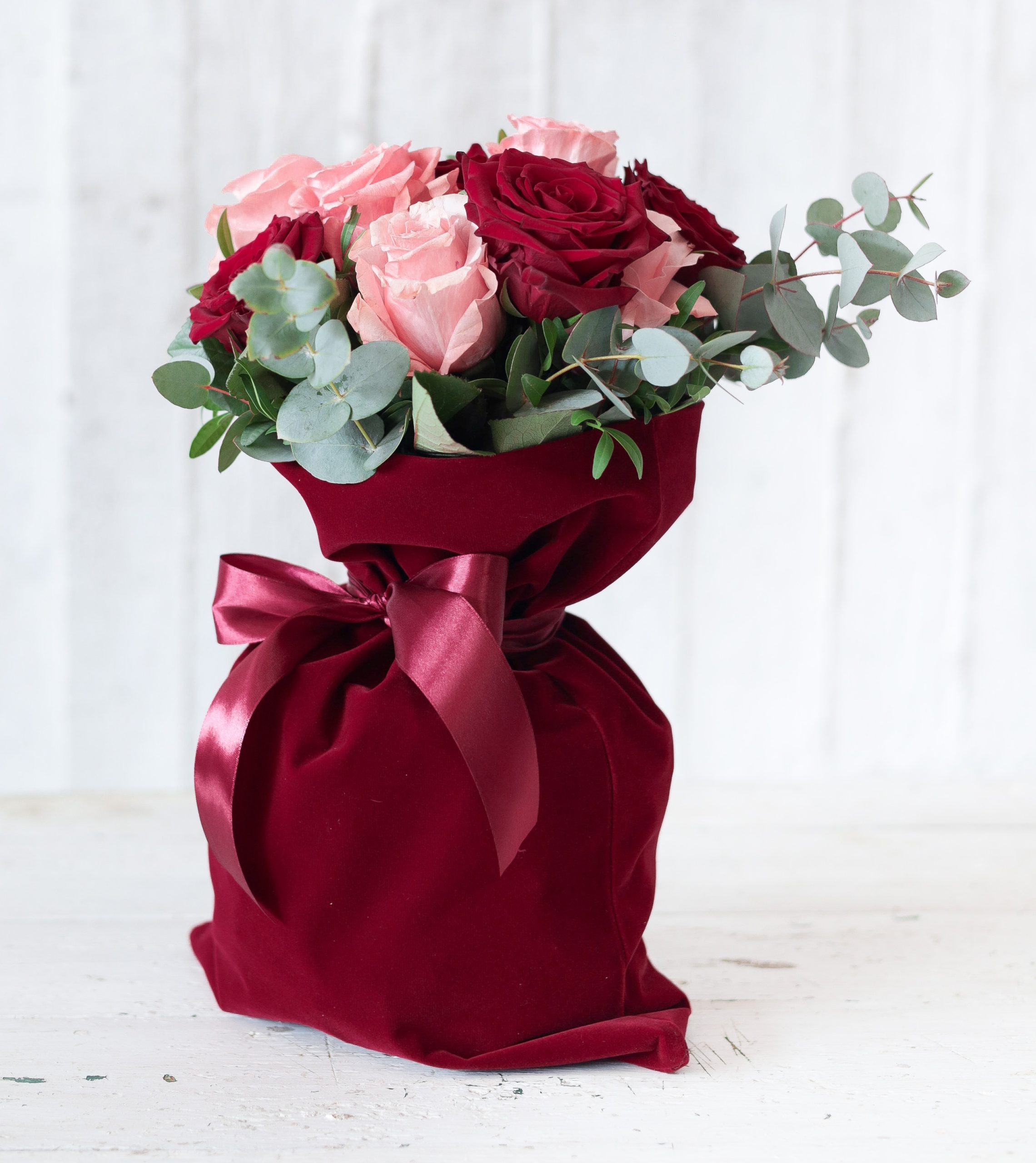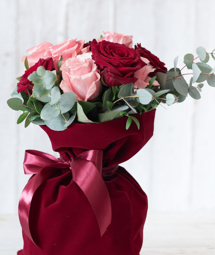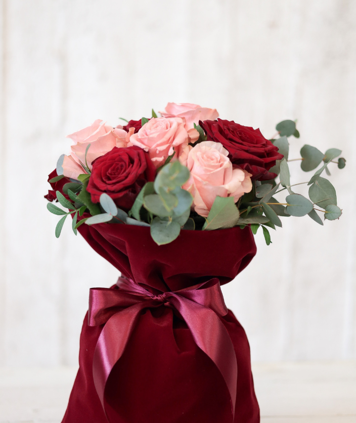 The Composition: A rich mix of (12) deep red and soft pink roses, beautifully accented with fresh eucalyptus for a modern touch.