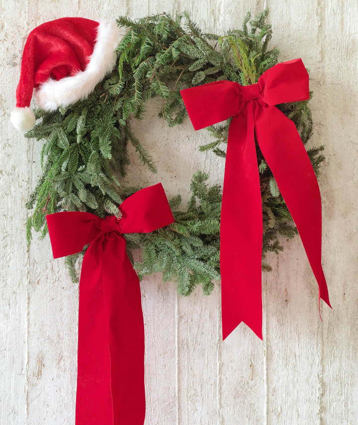 The Details: Features a signature red plush Santa hat and two oversized, hand-tied red velvet bows with long, elegant streamers.