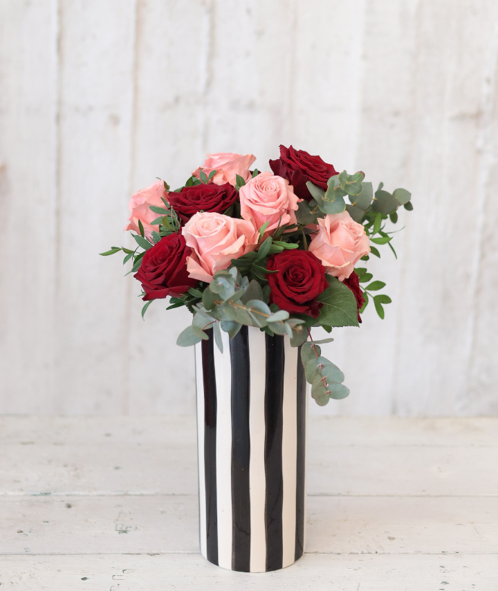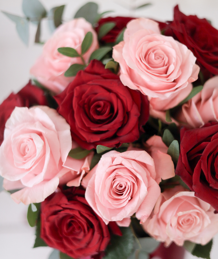 The Flowers: A perfectly balanced mix of six (6) passionate red roses and six (6) soft pink roses, accented with fresh eucalyptus for a textured, layered look.