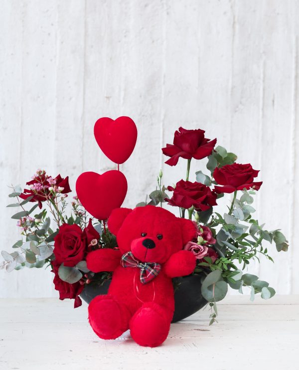 The Set: A plush red teddy bear paired with a vibrant bouquet of deep red roses and eucalyptus.